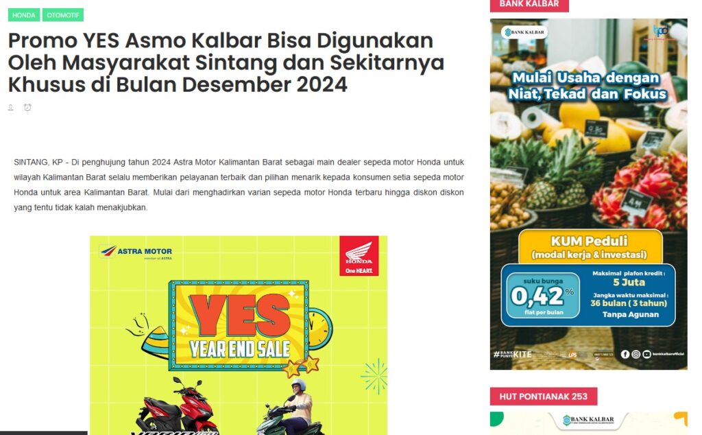 Promo YES Asmo Kalbar Bisa Digunakan Oleh Masyarakat Sintang dan Sekitarnya Khusus di Bulan Desember 2024 by Muhammad Arif 11 Desember 2024 in Silahkan kunjungi https://www.kapuaspost.web.id/2024/12/promo-yes-asmo-kalbar-bisa-digunakan.html. Tags: astra Astra Motor kalbar Astra Motor Pontianak astramotor honda kalbar pontianak sepeda motor You Might Like Regional Public Launching New ADV160 The SUV Pride Grand Launching New PCX 160 Truly Exceptional! Tetap hati-hati ya bro sist berkendara saat hujan.
