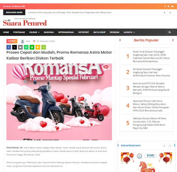 Proses Cepat dan Mudah, Promo Romansa Astra Motor Kalbar Berikan Diskon Terbaik by masmul 23 Februari 2026 in Silahkan kunjungi https://www.suarapemredkalbar.com/read/potret/23022026/proses-cepat-dan-mudah-promo-romansa-astra-motor-kalbar-berikan-diskon-terbaik. You Might Like Regional Public Launching New ADV160 The SUV Pride Grand Launching New PCX 160 Truly Exceptional! Tetap hati-hati ya bro sist berkendara saat hujan.