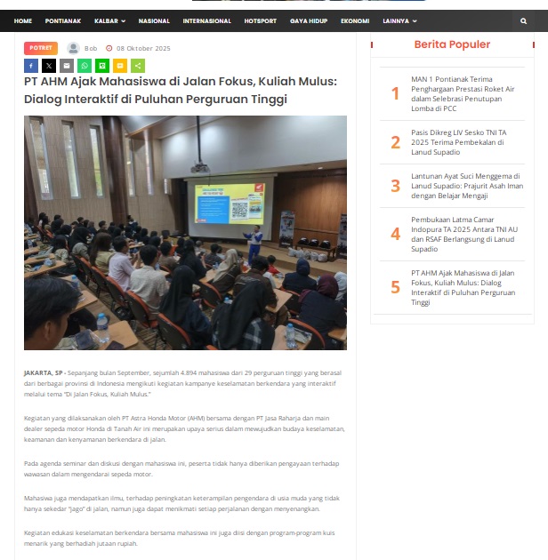 PT AHM Ajak Mahasiswa di Jalan Fokus, Kuliah Mulus: Dialog Interaktif di Puluhan Perguruan Tinggi by masmul 8 Oktober 2025 in Silahkan kunjungi https://www.suarapemredkalbar.com/read/potret/08102025/pt-ahm-ajak-mahasiswa-di-jalan-fokus-kuliah-mulus-dialog-interaktif-di-puluhan-perguruan-tinggi. You Might Like Regional Public Launching New ADV160 The SUV Pride Grand Launching New PCX 160 Truly Exceptional! Tetap hati-hati ya bro sist berkendara saat hujan.