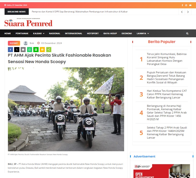 PT AHM Ajak Pecinta Skutik Fashionable Rasakan Sensasi New Honda Scoopy by masmul 3 Desember 2024 in Silahkan kunjungi https://www.suarapemredkalbar.com/read/potret/03122024/pt-ahm-ajak-pecinta-skutik-fashionable-rasakan-sensasi-new-honda-scoopy. You Might Like Regional Public Launching New ADV160 The SUV Pride Grand Launching New PCX 160 Truly Exceptional! Tetap hati-hati ya bro sist berkendara saat hujan.