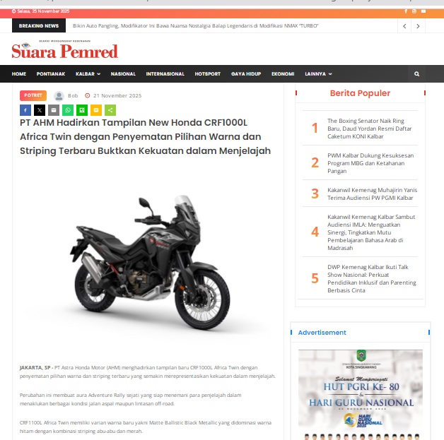 PT AHM Hadirkan Tampilan New Honda CRF1000L Africa Twin dengan Penyematan Pilihan Warna dan Striping Terbaru Buktkan Kekuatan dalam Menjelajah by masmul 21 November 2025 in Silahkan kunjungi https://www.suarapemredkalbar.com/read/potret/21112025/pt-ahm-hadirkan-tampilan-new-honda-crf1000l-africa-twin-dengan-penyematan-pilihan-warna-dan-striping-terbaru-buktkan-kekuatan-dalam-menjelajah. You Might Like Regional Public Launching New ADV160 The SUV Pride Grand Launching New PCX 160 Truly Exceptional! Tetap hati-hati ya bro sist berkendara saat hujan.