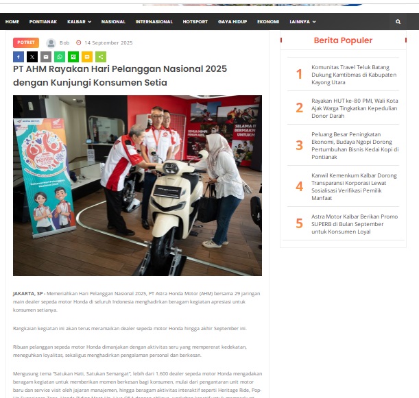PT AHM Rayakan Hari Pelanggan Nasional 2025 dengan Kunjungi Konsumen Setia by masmul 14 September 2025 in Silahkan kunjungi https://www.suarapemredkalbar.com/read/potret/14092025/pt-ahm-rayakan-hari-pelanggan-nasional-2025-dengan-kunjungi-konsumen-setia. You Might Like Regional Public Launching New ADV160 The SUV Pride Grand Launching New PCX 160 Truly Exceptional! Tetap hati-hati ya bro sist berkendara saat hujan.