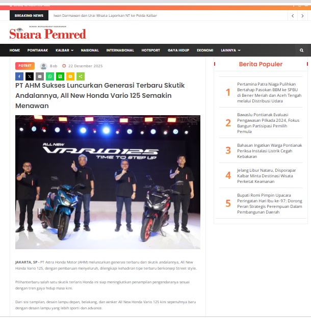 PT AHM Sukses Luncurkan Generasi Terbaru Skutik Andalannya, All New Honda Vario 125 Semakin Menawan by masmul 22 Desember 2025 in Silahkan kunjungi https://www.suarapemredkalbar.com/read/potret/22122025/pt-ahm-sukses-luncurkan-generasi-terbaru-skutik-andalannya-all-new-honda-vario-125-semakin-menawan. You Might Like Regional Public Launching New ADV160 The SUV Pride Grand Launching New PCX 160 Truly Exceptional! Tetap hati-hati ya bro sist berkendara saat hujan.