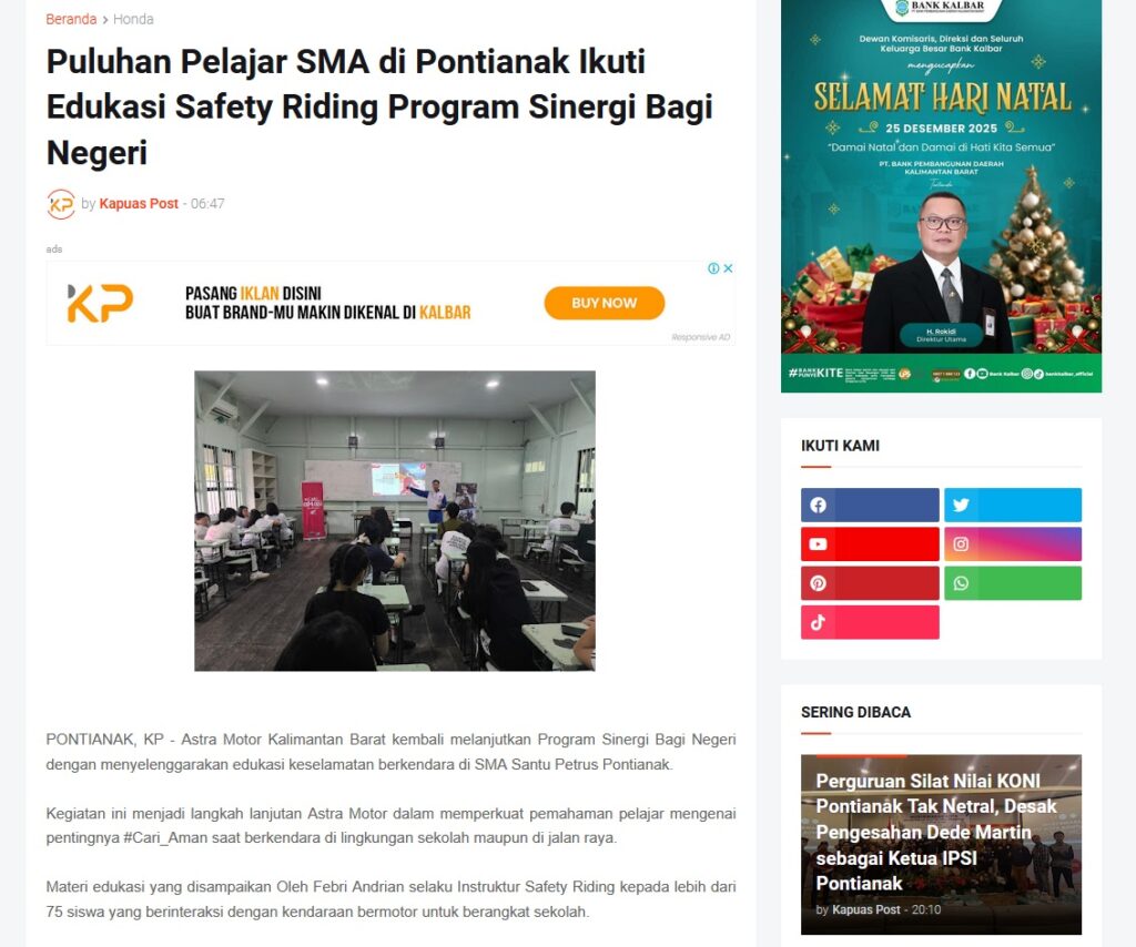 Puluhan Pelajar SMA di Pontianak Ikuti Edukasi Safety Riding Program Sinergi Bagi Negeri by Muhammad Arif 27 Desember 2025 in Silahkan kunjungi https://www.kapuaspost.web.id/2025/12/puluhan-pelajar-sma-di-pontianak-ikuti.html. Tags: astra Astra Motor kalbar Astra Motor Pontianak astramotor honda kalbar pontianak sepeda motor You Might Like Regional Public Launching New ADV160 The SUV Pride Grand Launching New PCX 160 Truly Exceptional! Tetap hati-hati ya bro sist berkendara saat hujan.