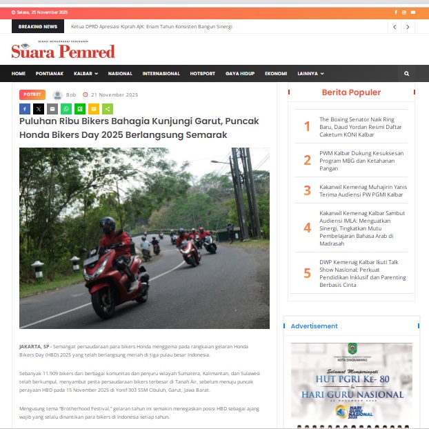 Puluhan Ribu Bikers Bahagia Kunjungi Garut, Puncak Honda Bikers Day 2025 Berlangsung Semarak by masmul 21 November 2025 in Silahkan kunjungi https://www.suarapemredkalbar.com/read/potret/21112025/puluhan-ribu-bikers-bahagia-kunjungi-garut-puncak-honda-bikers-day-2025-berlangsung-semarak. You Might Like Regional Public Launching New ADV160 The SUV Pride Grand Launching New PCX 160 Truly Exceptional! Tetap hati-hati ya bro sist berkendara saat hujan.