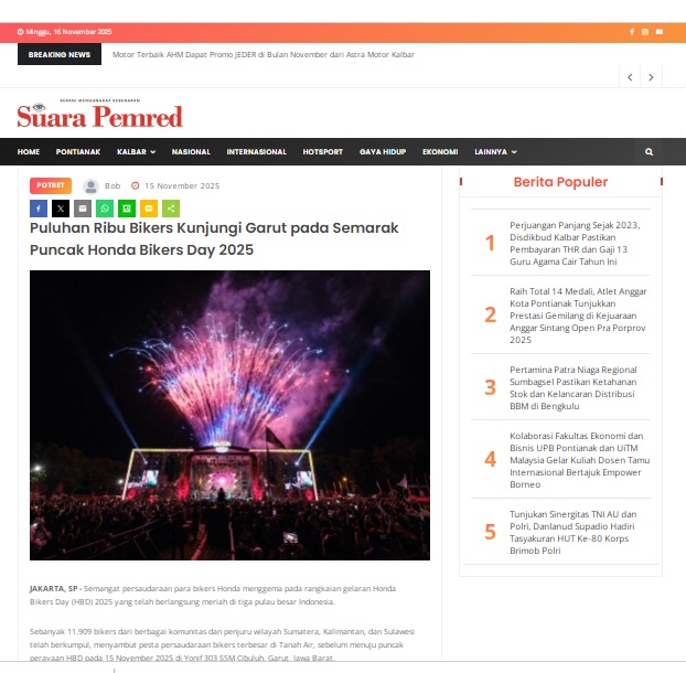 Puluhan Ribu Bikers Kunjungi Garut pada Semarak Puncak Honda Bikers Day 2025 by masmul 15 November 2025 in Silahkan kunjungi https://www.suarapemredkalbar.com/read/potret/15112025/puluhan-ribu-bikers-kunjungi-garut-pada-semarak-puncak-honda-bikers-day-2025. You Might Like Regional Public Launching New ADV160 The SUV Pride Grand Launching New PCX 160 Truly Exceptional! Tetap hati-hati ya bro sist berkendara saat hujan.