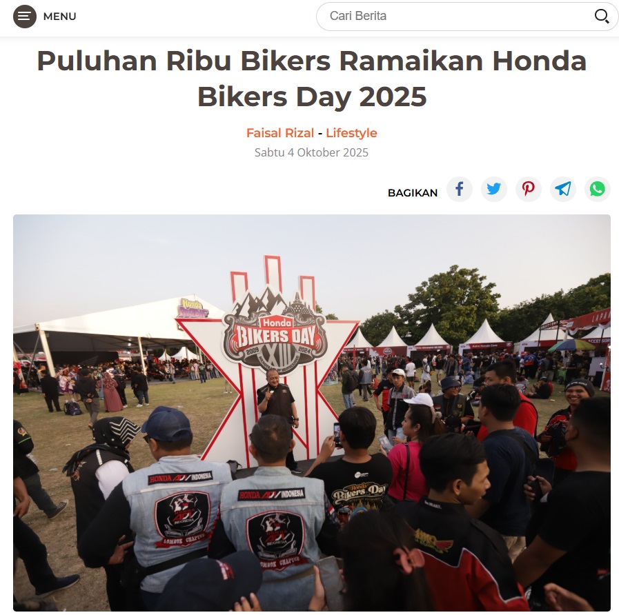 Puluhan Ribu Bikers Ramaikan Honda Bikers Day 2025 by Dodi Dodi 4 Oktober 2025 in Silahkan kunjungi https://harianberkat.com/2025/10/04/puluhan-ribu-bikers-ramaikan-honda-bikers-day-2025/. You Might Like Regional Public Launching New ADV160 The SUV Pride Grand Launching New PCX 160 Truly Exceptional! Tetap hati-hati ya bro sist berkendara saat hujan.