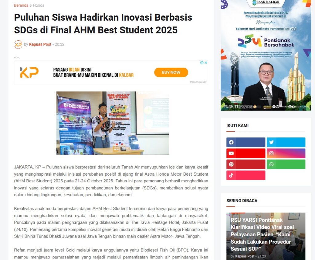 Puluhan Siswa Hadirkan Inovasi Berbasis SDGs di Final AHM Best Student 2025 by Muhammad Arif 11 November 2025 in Silahkan kunjungi https://www.kapuaspost.web.id/2025/11/puluhan-siswa-hadirkan-inovasi-berbasis.html. Tags: astra Astra Motor kalbar Astra Motor Pontianak astramotor honda kalbar pontianak sepeda motor You Might Like Regional Public Launching New ADV160 The SUV Pride Grand Launching New PCX 160 Truly Exceptional! Tetap hati-hati ya bro sist berkendara saat hujan.