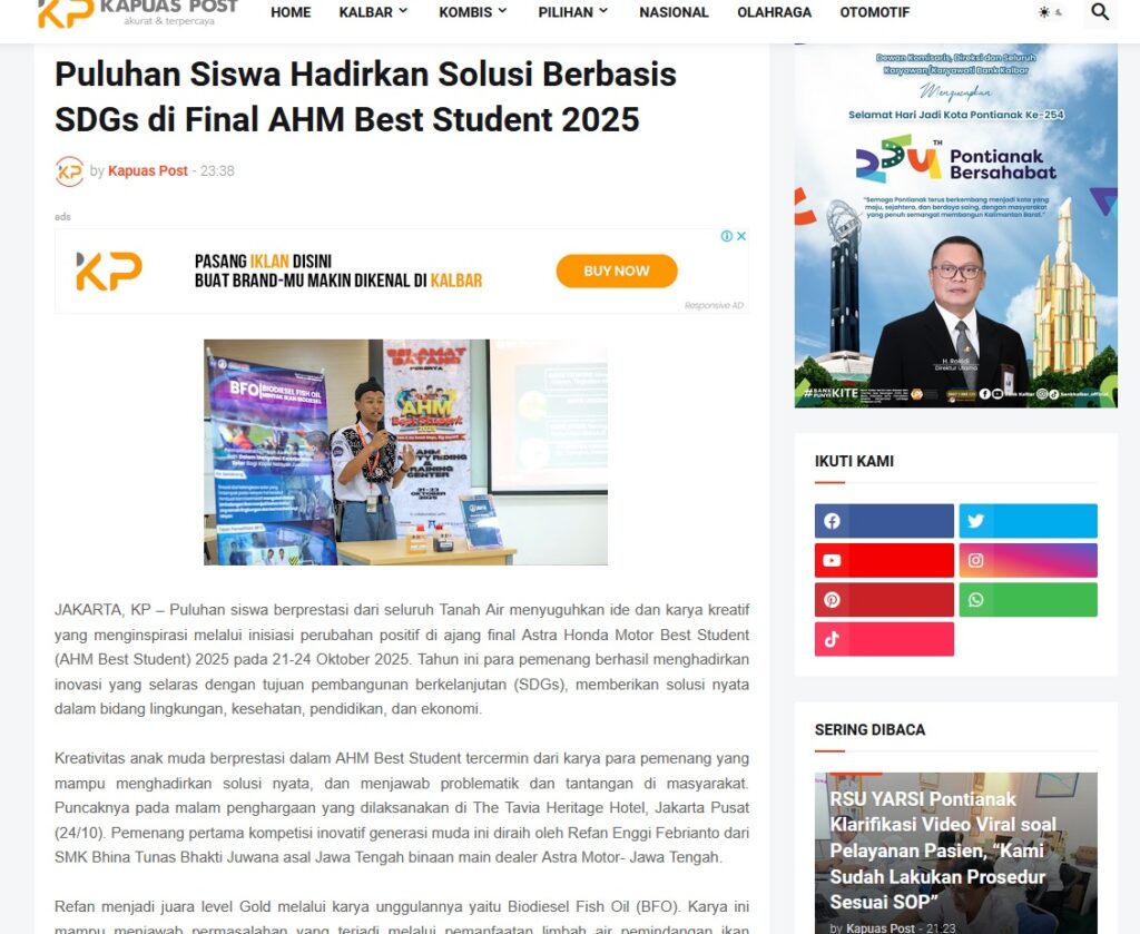 Puluhan Siswa Hadirkan Solusi Berbasis SDGs di Final AHM Best Student 2025 by Muhammad Arif 7 November 2025 in Silahkan kunjungi https://www.kapuaspost.web.id/2025/11/puluhan-siswa-hadirkan-solusi-berbasis.html. Tags: astra Astra Motor kalbar Astra Motor Pontianak astramotor honda kalbar pontianak sepeda motor You Might Like Regional Public Launching New ADV160 The SUV Pride Grand Launching New PCX 160 Truly Exceptional! Tetap hati-hati ya bro sist berkendara saat hujan.