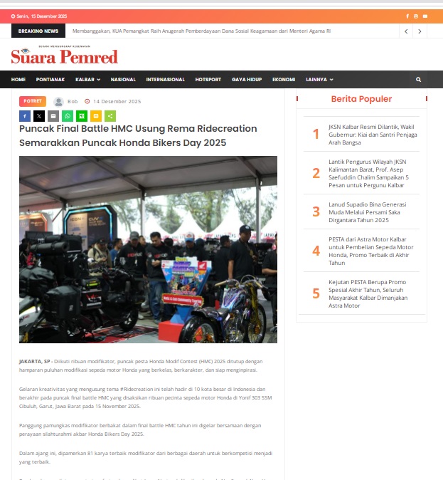 Puncak Final Battle HMC Usung Rema Ridecreation Semarakkan Puncak Honda Bikers Day 2025 by masmul 14 Desember 2025 in Silahkan kunjungi https://www.suarapemredkalbar.com/read/potret/14122025/puncak-final-battle-hmc-usung-rema-ridecreation-semarakkan-puncak-honda-bikers-day-2025. You Might Like Regional Public Launching New ADV160 The SUV Pride Grand Launching New PCX 160 Truly Exceptional! Tetap hati-hati ya bro sist berkendara saat hujan.