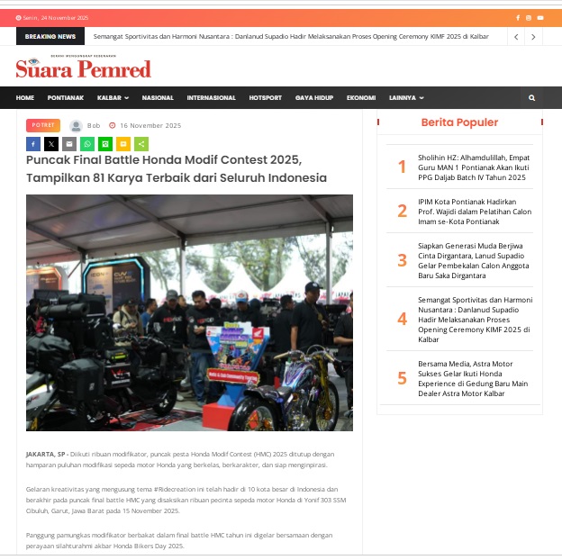 Puncak Final Battle Honda Modif Contest 2025, Tampilkan 81 Karya Terbaik dari Seluruh Indonesia by masmul 16 November 2025 in Silahkan kunjungi https://www.suarapemredkalbar.com/read/potret/16112025/puncak-final-battle-honda-modif-contest-2025-tampilkan-81-karya-terbaik-dari-seluruh-indonesia. You Might Like Regional Public Launching New ADV160 The SUV Pride Grand Launching New PCX 160 Truly Exceptional! Tetap hati-hati ya bro sist berkendara saat hujan.