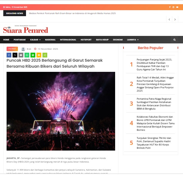 Puncak HBD 2025 Berlangsung di Garut Semarak Bersama Ribuan Bikers dari Seluruh Wilayah by masmul 13 November 2025 in Silahkan kunjungi https://www.suarapemredkalbar.com/read/potret/13112025/puncak-hbd-2025-berlangsung-di-garut-semarak-bersama-ribuan-bikers-dari-seluruh-wilayah. You Might Like Regional Public Launching New ADV160 The SUV Pride Grand Launching New PCX 160 Truly Exceptional! Tetap hati-hati ya bro sist berkendara saat hujan.