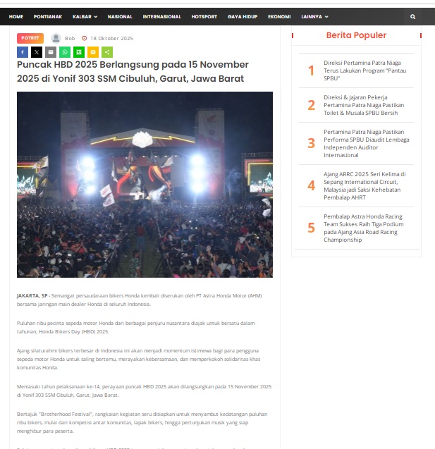 Puncak HBD 2025 Berlangsung pada 15 November 2025 di Yonif 303 SSM Cibuluh, Garut, Jawa Barat by masmul 18 Oktober 2025 in Silahkan kunjungi https://www.suarapemredkalbar.com/read/potret/18102025/puncak-hbd-2025-berlangsung-pada-15-november-2025-di-yonif-303-ssm-cibuluh-garut-jawa-barat. You Might Like Regional Public Launching New ADV160 The SUV Pride Grand Launching New PCX 160 Truly Exceptional! Tetap hati-hati ya bro sist berkendara saat hujan.