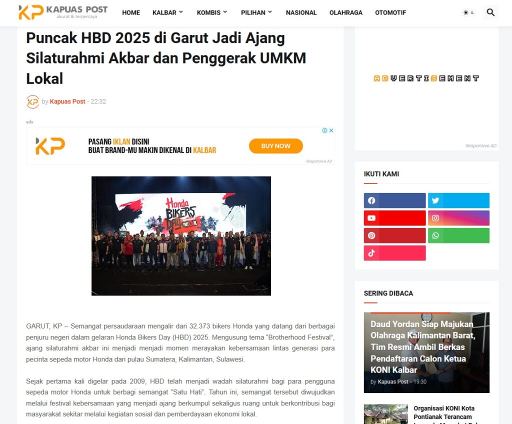 Puncak HBD 2025 di Garut Jadi Ajang Silaturahmi Akbar dan Penggerak UMKM Lokal by Muhammad Arif 19 November 2025 in Silahkan kunjungi https://www.kapuaspost.web.id/2025/11/puncak-hbd-2025-di-garut-jadi-ajang.html. Tags: astra Astra Motor kalbar Astra Motor Pontianak astramotor honda kalbar pontianak sepeda motor You Might Like Regional Public Launching New ADV160 The SUV Pride Grand Launching New PCX 160 Truly Exceptional! Tetap hati-hati ya bro sist berkendara saat hujan.