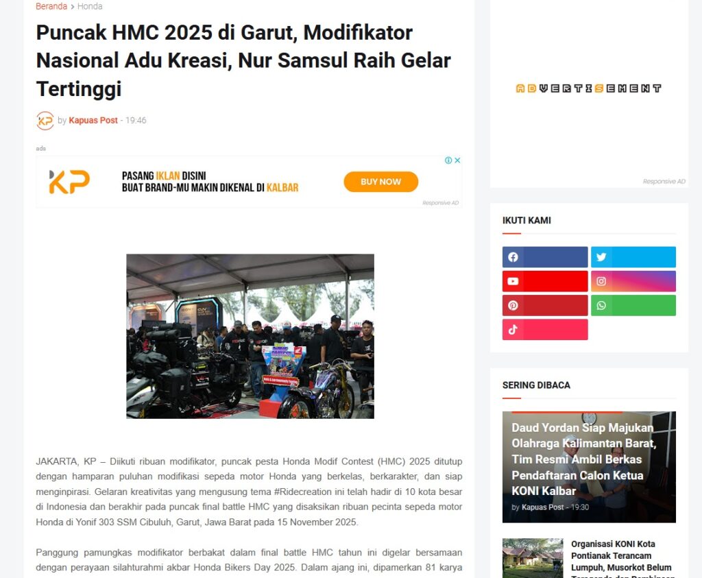 Puncak HMC 2025 di Garut, Modifikator Nasional Adu Kreasi, Nur Samsul Raih Gelar Tertinggi by Muhammad Arif 8 Desember 2025 in Silahkan kunjungi https://www.kapuaspost.web.id/2025/12/puncak-hmc-2025-di-garut-modifikator.html. Tags: astra Astra Motor kalbar Astra Motor Pontianak astramotor honda kalbar pontianak sepeda motor You Might Like Regional Public Launching New ADV160 The SUV Pride Grand Launching New PCX 160 Truly Exceptional! Tetap hati-hati ya bro sist berkendara saat hujan.