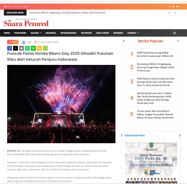 Puncak Pesta Honda Bikers Day 2025 Dihadiri Puluhan Ribu dari Seluruh Penjuru Indonesia by masmul 23 November 2025 in Silahkan kunjungi https://www.suarapemredkalbar.com/read/potret/23112025/puncak-pesta-honda-bikers-day-2025-dihadiri-puluhan-ribu-dari-seluruh-penjuru-indonesia. You Might Like Regional Public Launching New ADV160 The SUV Pride Grand Launching New PCX 160 Truly Exceptional! Tetap hati-hati ya bro sist berkendara saat hujan.