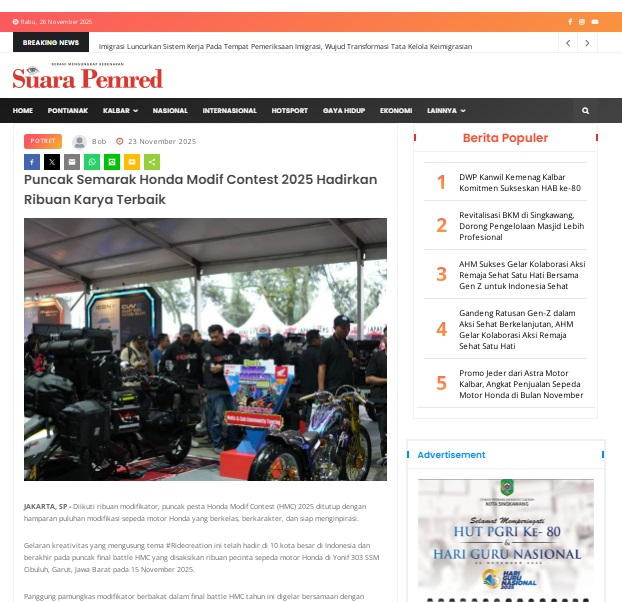 Puncak Semarak Honda Modif Contest 2025 Hadirkan Ribuan Karya Terbaik by masmul 23 November 2025 in Silahkan kunjungi https://www.suarapemredkalbar.com/read/potret/23112025/puncak-semarak-honda-modif-contest-2025-hadirkan-ribuan-karya-terbaik. You Might Like Regional Public Launching New ADV160 The SUV Pride Grand Launching New PCX 160 Truly Exceptional! Tetap hati-hati ya bro sist berkendara saat hujan.