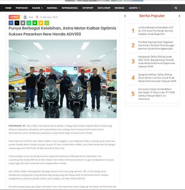 Punya Berbagai Kelebihan, Astra Motor Kalbar Optimis Sukses Pasarkan New Honda ADV160 by masmul 10 Oktober 2025 in Silahkan kunjungi https://www.suarapemredkalbar.com/read/potret/10102025/punya-berbagai-kelebihan-astra-motor-kalbar-optimis-sukses-pasarkan-new-honda-adv160. You Might Like Regional Public Launching New ADV160 The SUV Pride Grand Launching New PCX 160 Truly Exceptional! Tetap hati-hati ya bro sist berkendara saat hujan.