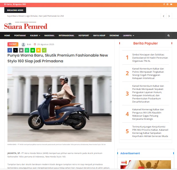 Punya Warna Baru, Skutik Premium Fashionable New Stylo 160 Siap jadi Primadona by masmul 25 Agustus 2025 in Silahkan kunjungi https://www.suarapemredkalbar.com/read/potret/25082025/punya-warna-baru-skutik-premium-fashionable-new-stylo-160-siap-jadi-primadona-1. You Might Like Regional Public Launching New ADV160 The SUV Pride Grand Launching New PCX 160 Truly Exceptional! Tetap hati-hati ya bro sist berkendara saat hujan.
