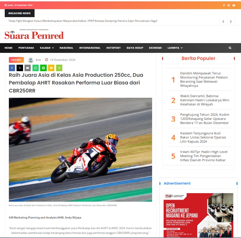Raih Juara Asia di Kelas Asia Production 250cc, Dua Pembalap AHRT Rasakan Performa Luar Biasa dari CBR250RR by masmul 14 Desember 2024 in Silahkan kunjungi https://www.suarapemredkalbar.com/read/potret/14122024/raih-juara-asia-di-kelas-asia-production-250cc-dua-pembalap-ahrt-rasakan-performa-luar-biasa-dari-cbr250rr. You Might Like Regional Public Launching New ADV160 The SUV Pride Grand Launching New PCX 160 Truly Exceptional! Tetap hati-hati ya bro sist berkendara saat hujan.
