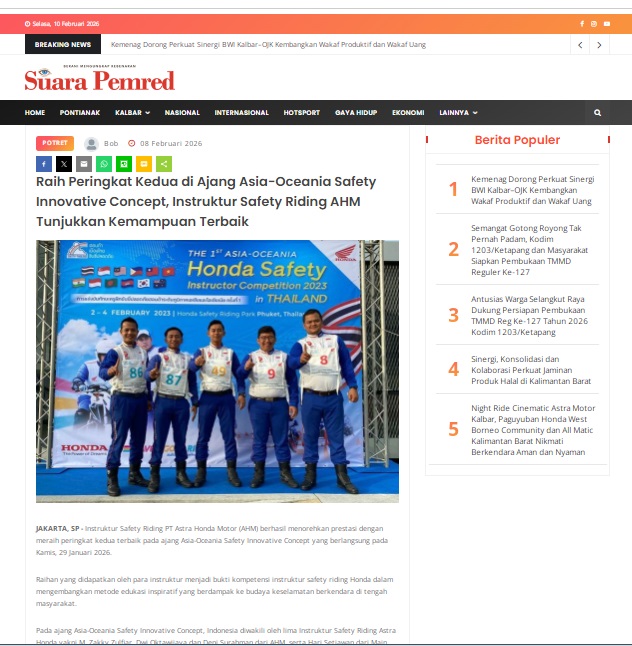 Raih Peringkat Kedua di Ajang Asia-Oceania Safety Innovative Concept, Instruktur Safety Riding AHM Tunjukkan Kemampuan Terbaik by masmul 8 Februari 2026 in Silahkan kunjungi https://www.suarapemredkalbar.com/read/potret/08022026/raih-peringkat-kedua-di-ajang-asia-oceania-safety-innovative-concept-instruktur-safety-riding-ahm-tunjukkan-kemampuan-terbaik. You Might Like Regional Public Launching New ADV160 The SUV Pride Grand Launching New PCX 160 Truly Exceptional! Tetap hati-hati ya bro sist berkendara saat hujan.