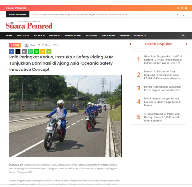 Raih Peringkat Kedua, Instruktur Safety Riding AHM Tunjukkan Dominasi di Ajang Asia-Oceania Safety Innovative Concept by masmul 25 Maret 2026 in Silahkan kunjungi https://www.suarapemredkalbar.com/read/potret/25032026/raih-peringkat-kedua-instruktur-safety-riding-ahm-tunjukkan-dominasi-di-ajang-asia-oceania-safety-innovative-concept. You Might Like Regional Public Launching New ADV160 The SUV Pride Grand Launching New PCX 160 Truly Exceptional! Tetap hati-hati ya bro sist berkendara saat hujan.