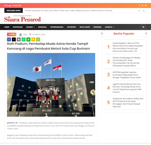 Raih Podium, Pembalap Muda Astra Honda Tampil Kencang di Laga Pembuka Moto4 Asia Cup Buriram by masmul 27 Maret 2026 in Silahkan kunjungi https://www.suarapemredkalbar.com/read/potret/27032026/raih-podium-pembalap-muda-astra-honda-tampil-kencang-di-laga-pembuka-moto4-asia-cup-buriram-2. You Might Like Regional Public Launching New ADV160 The SUV Pride Grand Launching New PCX 160 Truly Exceptional! Tetap hati-hati ya bro sist berkendara saat hujan.
