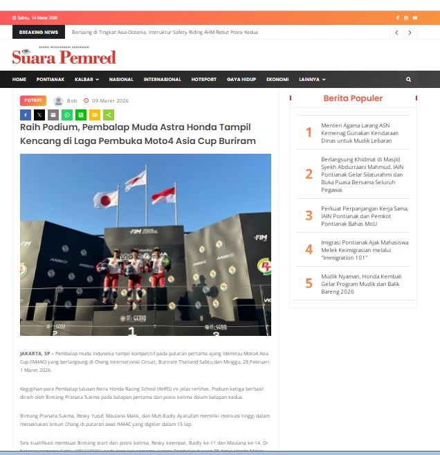 Raih Podium, Pembalap Muda Astra Honda Tampil Kencang di Laga Pembuka Moto4 Asia Cup Buriram by masmul 9 Maret 2026 in Silahkan kunjungi https://www.suarapemredkalbar.com/read/potret/09032026/raih-podium-pembalap-muda-astra-honda-tampil-kencang-di-laga-pembuka-moto4-asia-cup-buriram. You Might Like Regional Public Launching New ADV160 The SUV Pride Grand Launching New PCX 160 Truly Exceptional! Tetap hati-hati ya bro sist berkendara saat hujan.
