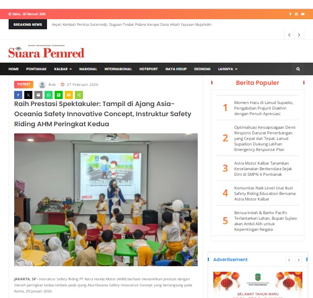 Raih Prestasi Spektakuler: Tampil di Ajang Asia-Oceania Safety Innovative Concept, Instruktur Safety Riding AHM Peringkat Kedua by masmul 27 Februari 2026 in Silahkan kunjungi https://www.suarapemredkalbar.com/read/potret/27022026/raih-prestasi-spektakuler-tampil-di-ajang-asia-oceania-safety-innovative-concept-instruktur-safety-riding-ahm-peringkat-kedua. You Might Like Regional Public Launching New ADV160 The SUV Pride Grand Launching New PCX 160 Truly Exceptional! Tetap hati-hati ya bro sist berkendara saat hujan.