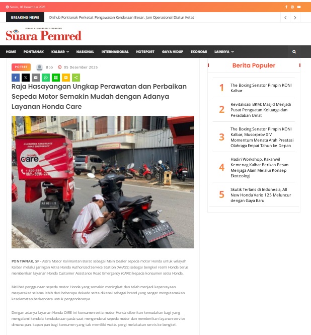 Raja Hasayangan Ungkap Perawatan dan Perbaikan Sepeda Motor Semakin Mudah dengan Adanya Layanan Honda Care by masmul 5 Desember 2025 in Silahkan kunjungi https://www.suarapemredkalbar.com/read/potret/05122025/raja-hasayangan-ungkap-perawatan-dan-perbaikan-sepeda-motor-semakin-mudah-dengan-adanya-layanan-honda-care. You Might Like Regional Public Launching New ADV160 The SUV Pride Grand Launching New PCX 160 Truly Exceptional! Tetap hati-hati ya bro sist berkendara saat hujan.