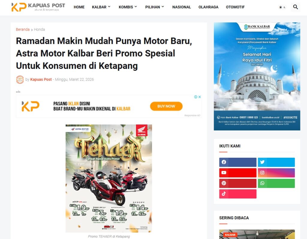 Ramadan Makin Mudah Punya Motor Baru, Astra Motor Kalbar Beri Promo Spesial Untuk Konsumen di Ketapang by Muhammad Arif 22 Maret 2026 in Silahkan kunjungi https://www.kapuaspost.web.id/2026/03/ramadan-makin-mudah-punya-motor-baru.html. Tags: astra Astra Motor kalbar Astra Motor Pontianak astramotor honda kalbar pontianak sepeda motor You Might Like Regional Public Launching New ADV160 The SUV Pride Grand Launching New PCX 160 Truly Exceptional! Tetap hati-hati ya bro sist berkendara saat hujan.