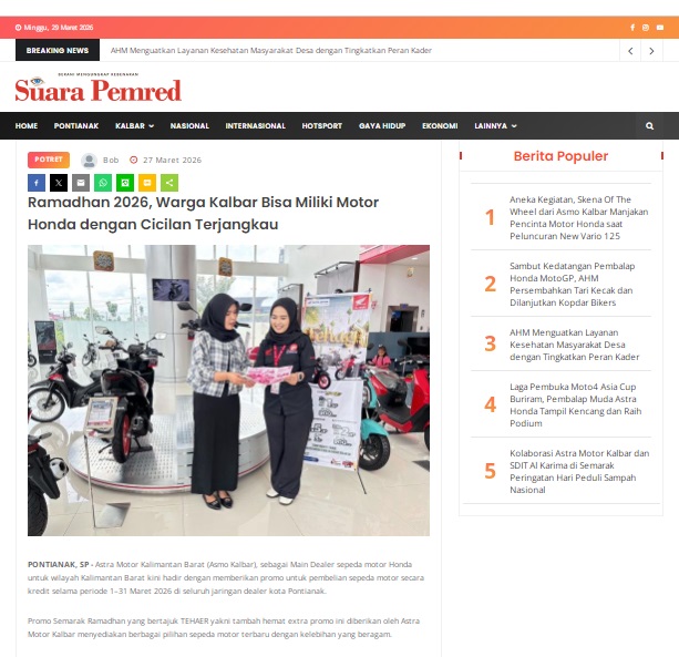 Ramadhan 2026, Warga Kalbar Bisa Miliki Motor Honda dengan Cicilan Terjangkau by masmul 27 Maret 2026 in Silahkan kunjungi https://www.suarapemredkalbar.com/read/potret/27032026/ramadhan-2026-warga-kalbar-bisa-miliki-motor-honda-dengan-cicilan-terjangkau. You Might Like Regional Public Launching New ADV160 The SUV Pride Grand Launching New PCX 160 Truly Exceptional! Tetap hati-hati ya bro sist berkendara saat hujan.