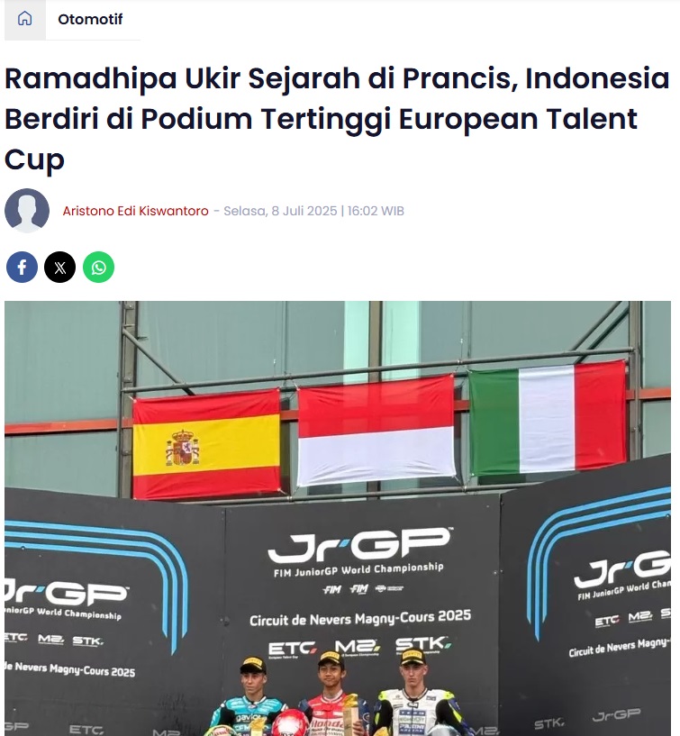 Ramadhipa Ukir Sejarah di Prancis, Indonesia Berdiri di Podium Tertinggi European Talent Cup by Aristono Edi Kiswantoro 8 Juli 2025 in Silahkan kunjungi https://pontianakpost.jawapos.com/otomotif/1466240958/ramadhipa-ukir-sejarah-di-prancis-indonesia-berdiri-di-podium-tertinggi-european-talent-cup. You Might Like Regional Public Launching New ADV160 The SUV Pride Grand Launching New PCX 160 Truly Exceptional! Tetap hati-hati ya bro sist berkendara saat hujan.
