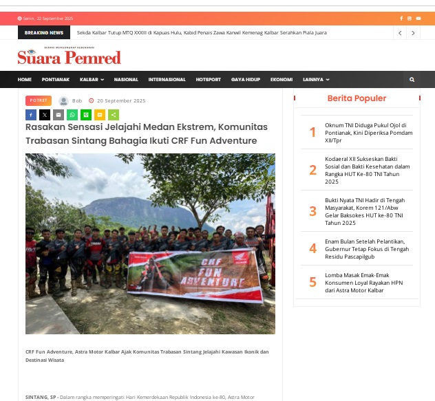 Rasakan Sensasi Jelajahi Medan Ekstrem, Komunitas Trabasan Sintang Bahagia Ikuti CRF Fun Adventure by masmul 20 September 2025 in Silahkan kunjungi https://www.suarapemredkalbar.com/read/potret/20092025/rasakan-sensasi-jelajahi-medan-ekstrem-komunitas-trabasan-sintang-bahagia-ikuti-crf-fun-adventure. You Might Like Regional Public Launching New ADV160 The SUV Pride Grand Launching New PCX 160 Truly Exceptional! Tetap hati-hati ya bro sist berkendara saat hujan.