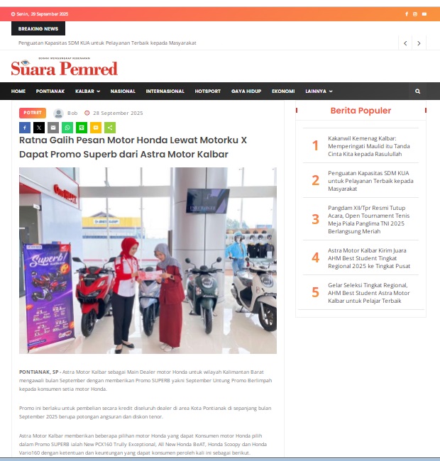 Ratna Galih Pesan Motor Honda Lewat Motorku X Dapat Promo Superb dari Astra Motor Kalbar by masmul 28 September 2025 in Silahkan kunjungi https://www.suarapemredkalbar.com/read/potret/28092025/ratna-galih-pesan-motor-honda-lewat-motorku-x-dapat-promo-superb-dari-astra-motor-kalbar. You Might Like Regional Public Launching New ADV160 The SUV Pride Grand Launching New PCX 160 Truly Exceptional! Tetap hati-hati ya bro sist berkendara saat hujan.