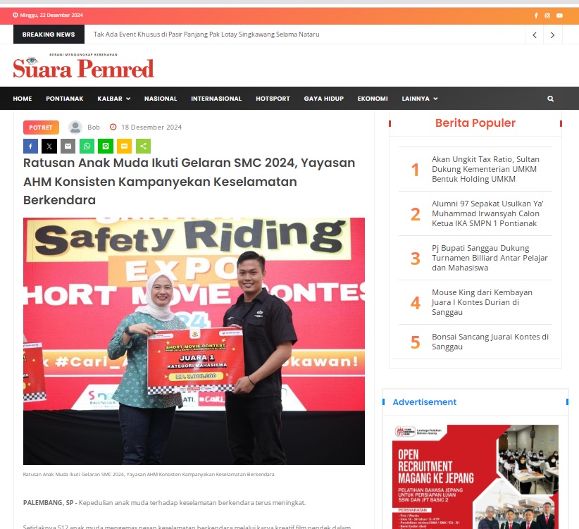 Ratusan Anak Muda Ikuti Gelaran SMC 2024, Yayasan AHM Konsisten Kampanyekan Keselamatan Berkendara by masmul 18 Desember 2024 in Silahkan kunjungi https://www.suarapemredkalbar.com/read/potret/18122024/ratusan-anak-muda-ikuti-gelaran-smc-2024-yayasan-ahm-konsisten-kampanyekan-keselamatan-berkendara. You Might Like Regional Public Launching New ADV160 The SUV Pride Grand Launching New PCX 160 Truly Exceptional! Tetap hati-hati ya bro sist berkendara saat hujan.