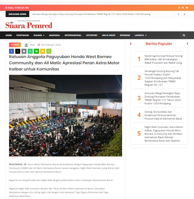 Ratusan Anggota Paguyuban Honda West Borneo Community dan All Matic Apresiasi Peran Astra Motor Kalbar untuk Komunitas by masmul 8 Februari 2026 in Silahkan kunjungi https://www.suarapemredkalbar.com/read/potret/08022026/ratusan-anggota-paguyuban-honda-west-borneo-community-dan-all-matic-apresiasi-peran-astra-motor-kalbar-untuk-komunitas. You Might Like Regional Public Launching New ADV160 The SUV Pride Grand Launching New PCX 160 Truly Exceptional! Tetap hati-hati ya bro sist berkendara saat hujan.