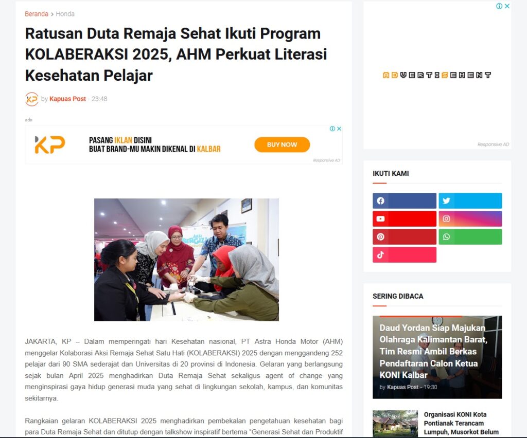 Ratusan Duta Remaja Sehat Ikuti Program KOLABERAKSI 2025, AHM Perkuat Literasi Kesehatan Pelajar by Muhammad Arif 26 November 2025 in Silahkan kunjungi https://www.kapuaspost.web.id/2025/11/ratusan-duta-remaja-sehat-ikuti-program.html. Tags: astra Astra Motor kalbar Astra Motor Pontianak astramotor honda kalbar pontianak sepeda motor You Might Like Regional Public Launching New ADV160 The SUV Pride Grand Launching New PCX 160 Truly Exceptional! Tetap hati-hati ya bro sist berkendara saat hujan.