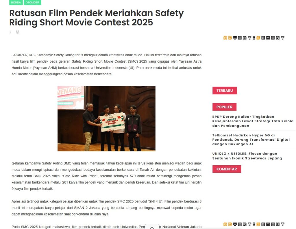 Ratusan Film Pendek Meriahkan Safety Riding Short Movie Contest 2025 by Muhammad Arif 5 Oktober 2025 in Silahkan kunjungi https://www.kapuaspost.web.id/2025/10/ratusan-film-pendek-meriahkan-safety.html. Tags: astra Astra Motor kalbar Astra Motor Pontianak astramotor honda kalbar pontianak sepeda motor You Might Like Regional Public Launching New ADV160 The SUV Pride Grand Launching New PCX 160 Truly Exceptional! Tetap hati-hati ya bro sist berkendara saat hujan.