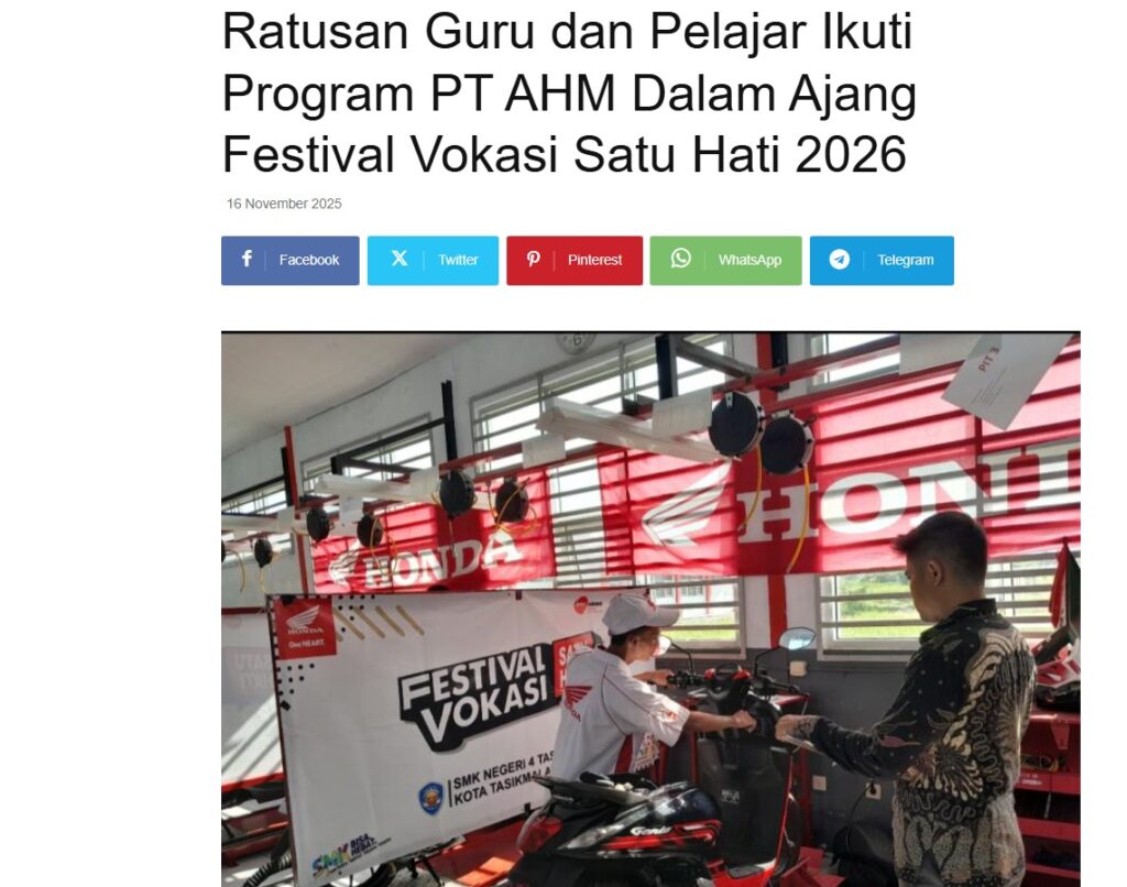 Ratusan Guru dan Pelajar Ikuti Program PT AHM Dalam Ajang Festival Vokasi Satu Hati 2026 by Nova Sari 16 November 2025 in Silahkan kunjungi https://equator.co.id/ratusan-guru-dan-pelajar-ikuti-program-pt-ahm-dalam-ajang-festival-vokasi-satu-hati-2026/. You Might Like Regional Public Launching New ADV160 The SUV Pride Grand Launching New PCX 160 Truly Exceptional! Tetap hati-hati ya bro sist berkendara saat hujan.