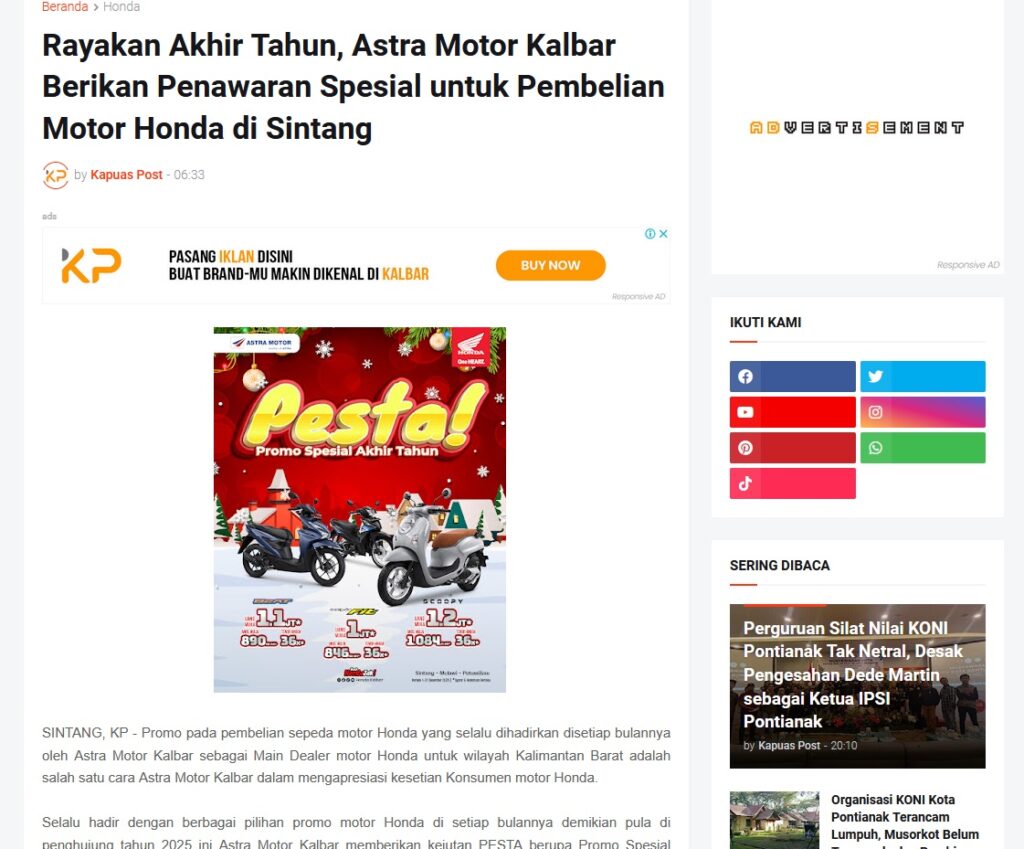 Rayakan Akhir Tahun, Astra Motor Kalbar Berikan Penawaran Spesial untuk Pembelian Motor Honda di Sintang by Muhammad Arif 19 Desember 2025 in Silahkan kunjungi https://www.kapuaspost.web.id/2025/12/rayakan-akhir-tahun-astra-motor-kalbar.html. Tags: astra Astra Motor kalbar Astra Motor Pontianak astramotor honda kalbar pontianak sepeda motor You Might Like Regional Public Launching New ADV160 The SUV Pride Grand Launching New PCX 160 Truly Exceptional! Tetap hati-hati ya bro sist berkendara saat hujan.