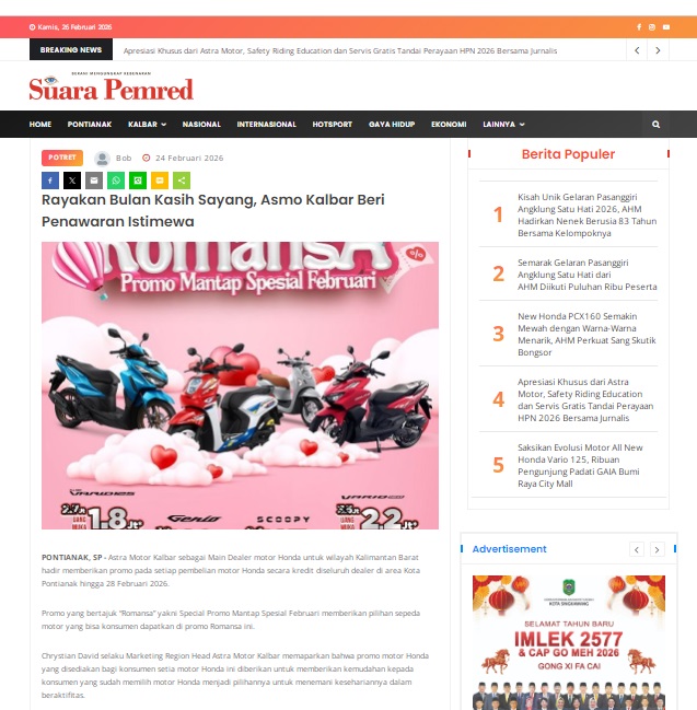 Rayakan Bulan Kasih Sayang, Asmo Kalbar Beri Penawaran Istimewa by masmul 24 Februari 2026 in Silahkan kunjungi https://www.suarapemredkalbar.com/read/potret/24022026/rayakan-bulan-kasih-sayang-asmo-kalbar-beri-penawaran-istimewa. You Might Like Regional Public Launching New ADV160 The SUV Pride Grand Launching New PCX 160 Truly Exceptional! Tetap hati-hati ya bro sist berkendara saat hujan.