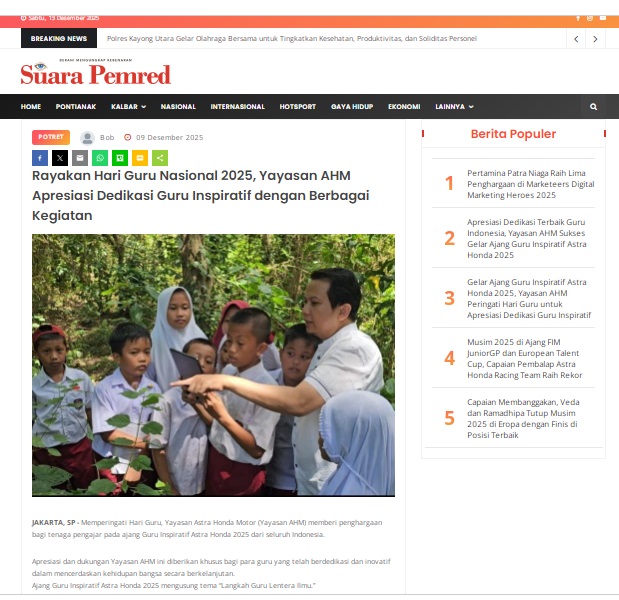 Rayakan Hari Guru Nasional 2025, Yayasan AHM Apresiasi Dedikasi Guru Inspiratif dengan Berbagai Kegiatan by masmul 9 Desember 2025 in Silahkan kunjungi https://www.suarapemredkalbar.com/read/potret/09122025/rayakan-hari-guru-nasional-2025-yayasan-ahm-apresiasi-dedikasi-guru-inspiratif-dengan-berbagai-kegiatan. You Might Like Regional Public Launching New ADV160 The SUV Pride Grand Launching New PCX 160 Truly Exceptional! Tetap hati-hati ya bro sist berkendara saat hujan.