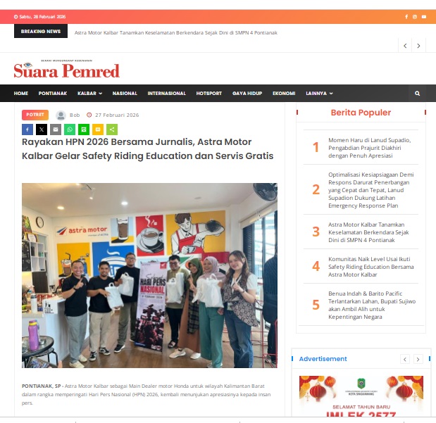 Rayakan HPN 2026 Bersama Jurnalis, Astra Motor Kalbar Gelar Safety Riding Education dan Servis Gratis by masmul 27 Februari 2026 in Silahkan kunjungi https://www.suarapemredkalbar.com/read/potret/27022026/rayakan-hpn-2026-bersama-jurnalis-astra-motor-kalbar-gelar-safety-riding-education-dan-servis-gratis-1. You Might Like Regional Public Launching New ADV160 The SUV Pride Grand Launching New PCX 160 Truly Exceptional! Tetap hati-hati ya bro sist berkendara saat hujan.
