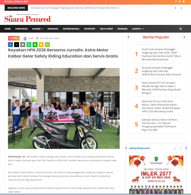 Rayakan HPN 2026 Bersama Jurnalis: Astra Motor Kalbar Gelar Safety Riding Education dan Servis Gratis by masmul 22 Februari 2026 in Silahkan kunjungi https://www.suarapemredkalbar.com/read/potret/22022026/rayakan-hpn-2026-bersama-jurnalis-astra-motor-kalbar-gelar-safety-riding-education-dan-servis-gratis. You Might Like Regional Public Launching New ADV160 The SUV Pride Grand Launching New PCX 160 Truly Exceptional! Tetap hati-hati ya bro sist berkendara saat hujan.