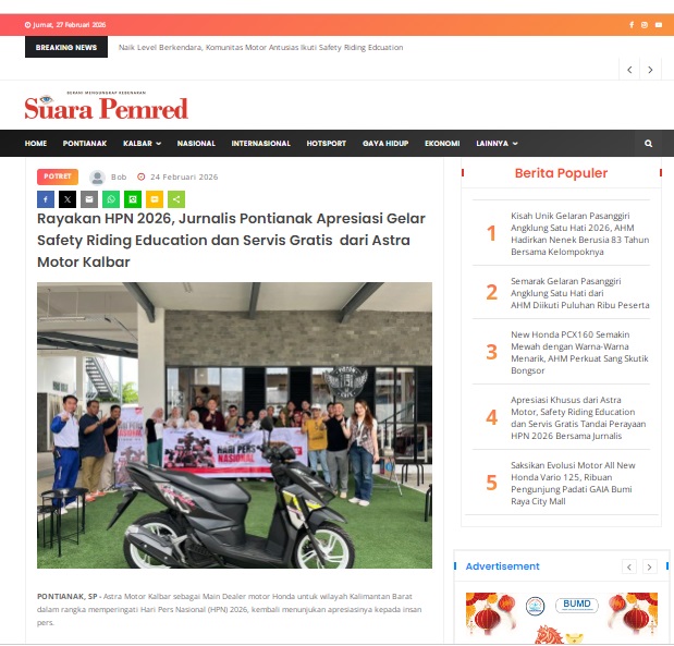 Rayakan HPN 2026, Jurnalis Pontianak Apresiasi Gelar Safety Riding Education dan Servis Gratis dari Astra Motor Kalbar by masmul 24 Februari 2026 in Silahkan kunjungi https://www.suarapemredkalbar.com/read/potret/24022026/rayakan-hpn-2026-jurnalis-pontianak-apresiasi-gelar-safety-riding-education-dan-servis-gratis-dari-astra-motor-kalbar. You Might Like Regional Public Launching New ADV160 The SUV Pride Grand Launching New PCX 160 Truly Exceptional! Tetap hati-hati ya bro sist berkendara saat hujan.