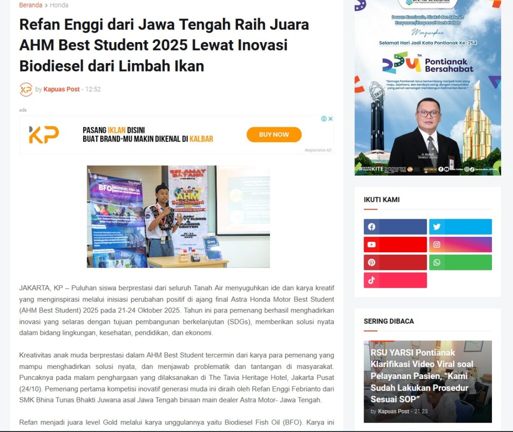 Refan Enggi dari Jawa Tengah Raih Juara AHM Best Student 2025 Lewat Inovasi Biodiesel dari Limbah Ikan by Muhammad Arif 27 Oktober 2025 in Silahkan kunjungi https://www.kapuaspost.web.id/2025/10/refan-enggi-dari-jawa-tengah-raih-juara.html. Tags: astra Astra Motor kalbar Astra Motor Pontianak astramotor honda kalbar pontianak sepeda motor You Might Like Regional Public Launching New ADV160 The SUV Pride Grand Launching New PCX 160 Truly Exceptional! Tetap hati-hati ya bro sist berkendara saat hujan.