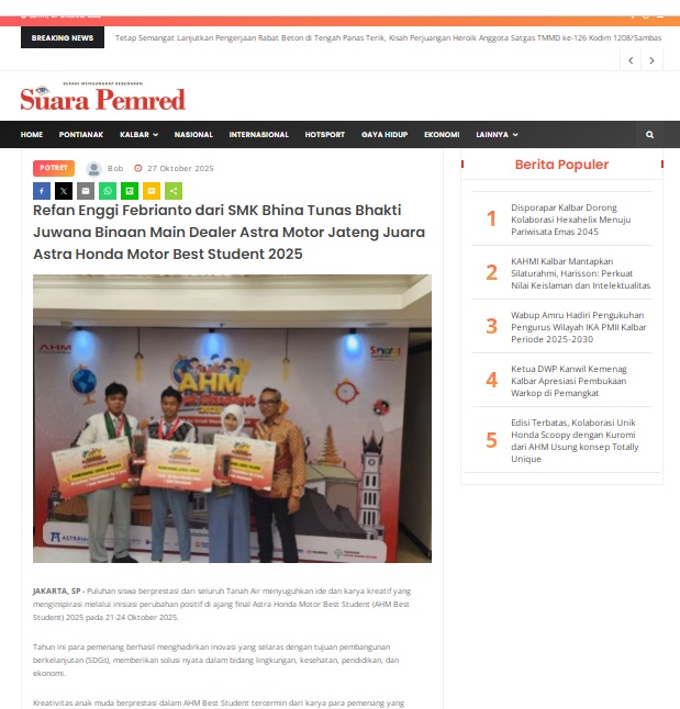 Refan Enggi Febrianto dari SMK Bhina Tunas Bhakti Juwana Binaan Main Dealer Astra Motor Jateng Juara Astra Honda Motor Best Student 2025 by masmul 27 Oktober 2025 in Silahkan kunjungi https://www.suarapemredkalbar.com/read/potret/27102025/refan-enggi-febrianto-dari-smk-bhina-tunas-bhakti-juwana-binaan-main-dealer-astra-motor-jateng-juara-astra-honda-motor-best-student-2025. You Might Like Regional Public Launching New ADV160 The SUV Pride Grand Launching New PCX 160 Truly Exceptional! Tetap hati-hati ya bro sist berkendara saat hujan.