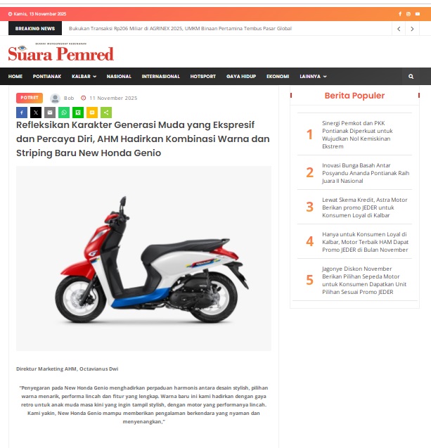 Refleksikan Karakter Generasi Muda yang Ekspresif dan Percaya Diri, AHM Hadirkan Kombinasi Warna dan Striping Baru New Honda Genio by masmul 11 November 2025 in Silahkan kunjungi https://www.suarapemredkalbar.com/read/potret/11112025/refleksikan-karakter-generasi-muda-yang-ekspresif-dan-percaya-diri-ahm-hadirkan-kombinasi-warna-dan-striping-baru-new-honda-genio. You Might Like Regional Public Launching New ADV160 The SUV Pride Grand Launching New PCX 160 Truly Exceptional! Tetap hati-hati ya bro sist berkendara saat hujan.