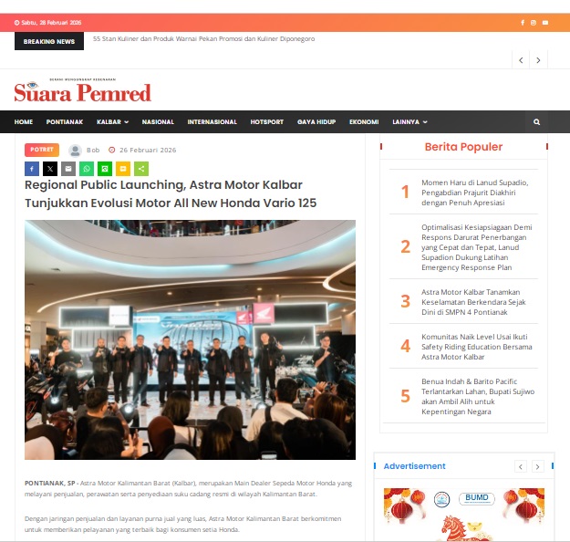 Regional Public Launching, Astra Motor Kalbar Tunjukkan Evolusi Motor All New Honda Vario 125 by masmul 26 Februari 2026 in Silahkan kunjungi https://www.suarapemredkalbar.com/read/potret/26022026/regional-public-launching-astra-motor-kalbar-tunjukkan-evolusi-motor-all-new-honda-vario-125. You Might Like Regional Public Launching New ADV160 The SUV Pride Grand Launching New PCX 160 Truly Exceptional! Tetap hati-hati ya bro sist berkendara saat hujan.
